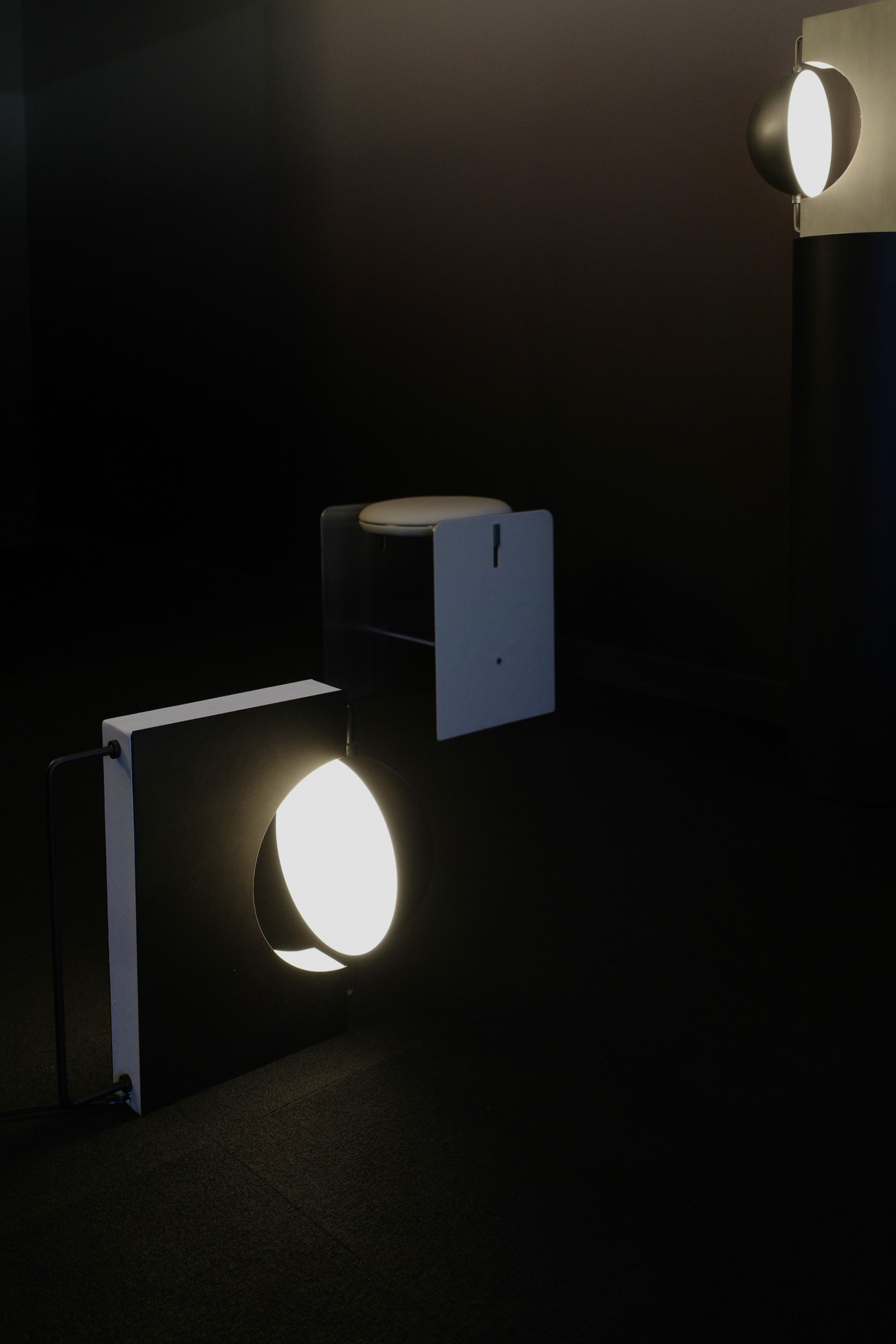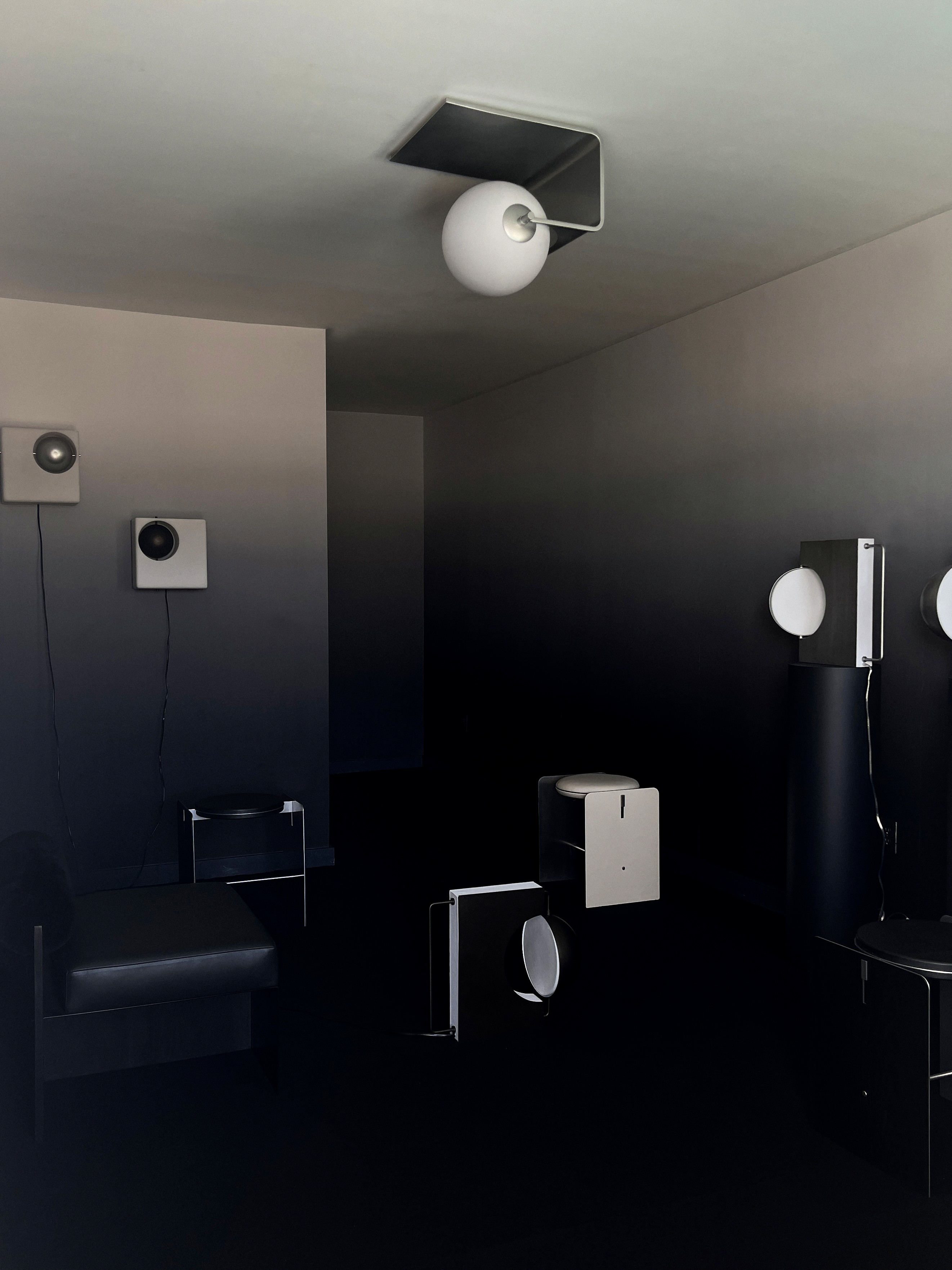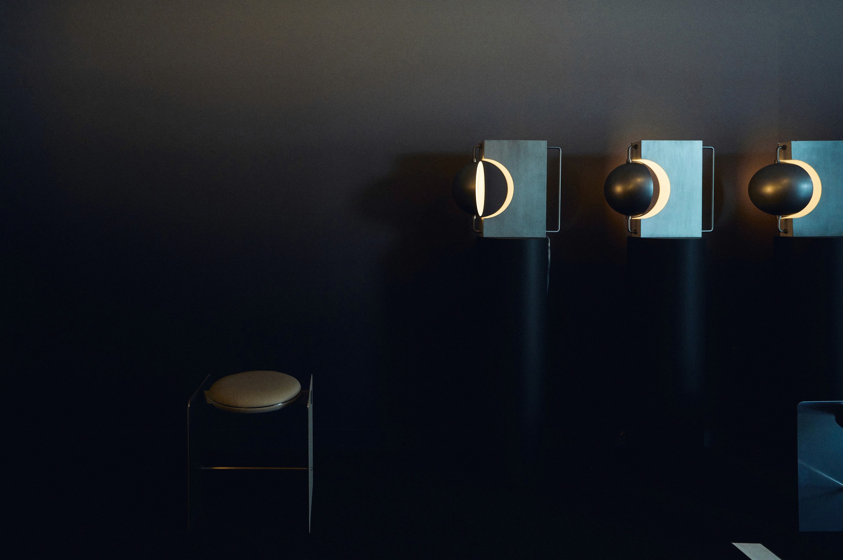 An immersive solo exhibition introducing two new celestial-inspired light fixtures (ceiling light and wall sconces) along with her architectural furnishings, table lamps, and ceramic tableware sets. Designed to emulate the dark vastness of space, Xiong’s exhibition explores the natural curiosity and unexplainable calm of our galaxy with planet-like light fixtures that appear to float in mid-air. Washed in Xiong’s signature black-and-white gradient hues, Before the Eclipse also invites a meditative experience that emphasizes texture, material, and craft–key design traits that often take a backseat to color. Set in a dark, moody hotel room, with black carpeted floors and black-to-white gradient wallpaper from Calico Wallpaper’s Aurora Collection in the Eclipse colorway, Xiong’s new ceiling lamp and wall sconces are the centerpieces of the exhibition, and the room’s only light sources. The new Void Wall Sconces are two boxy cast resin lights with a metal globe inside to emulate the dark glow of an eclipse. The dark metal sphere is designed to look like it’s suspended in thin air–a design tactic Xiong often uses to make a complicated design technique appear simple. Showcased in brushed aluminum and golden black metal, the fixtures play with the contrast of darkness and light, manipulating what gets to be illuminated and what is concealed.