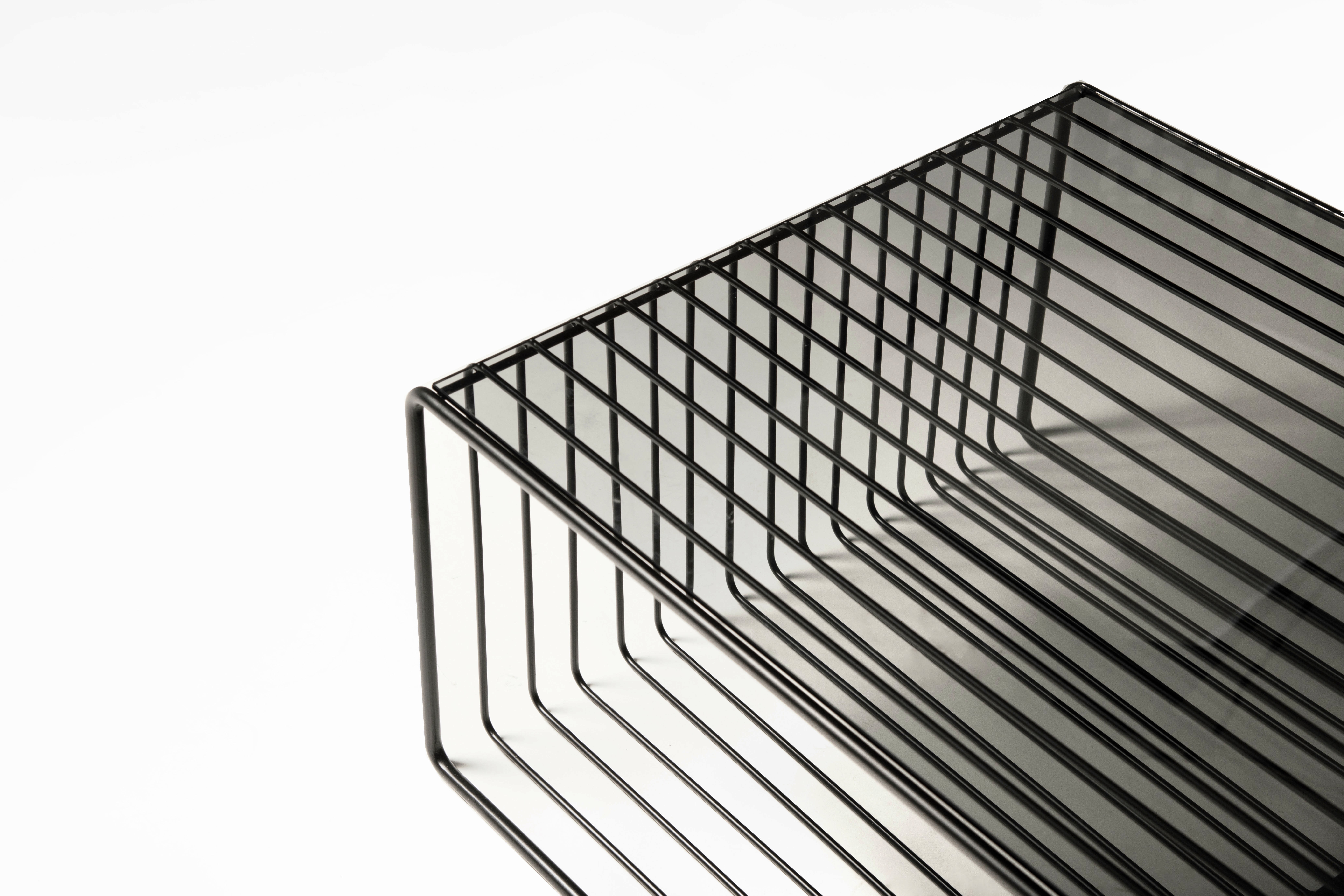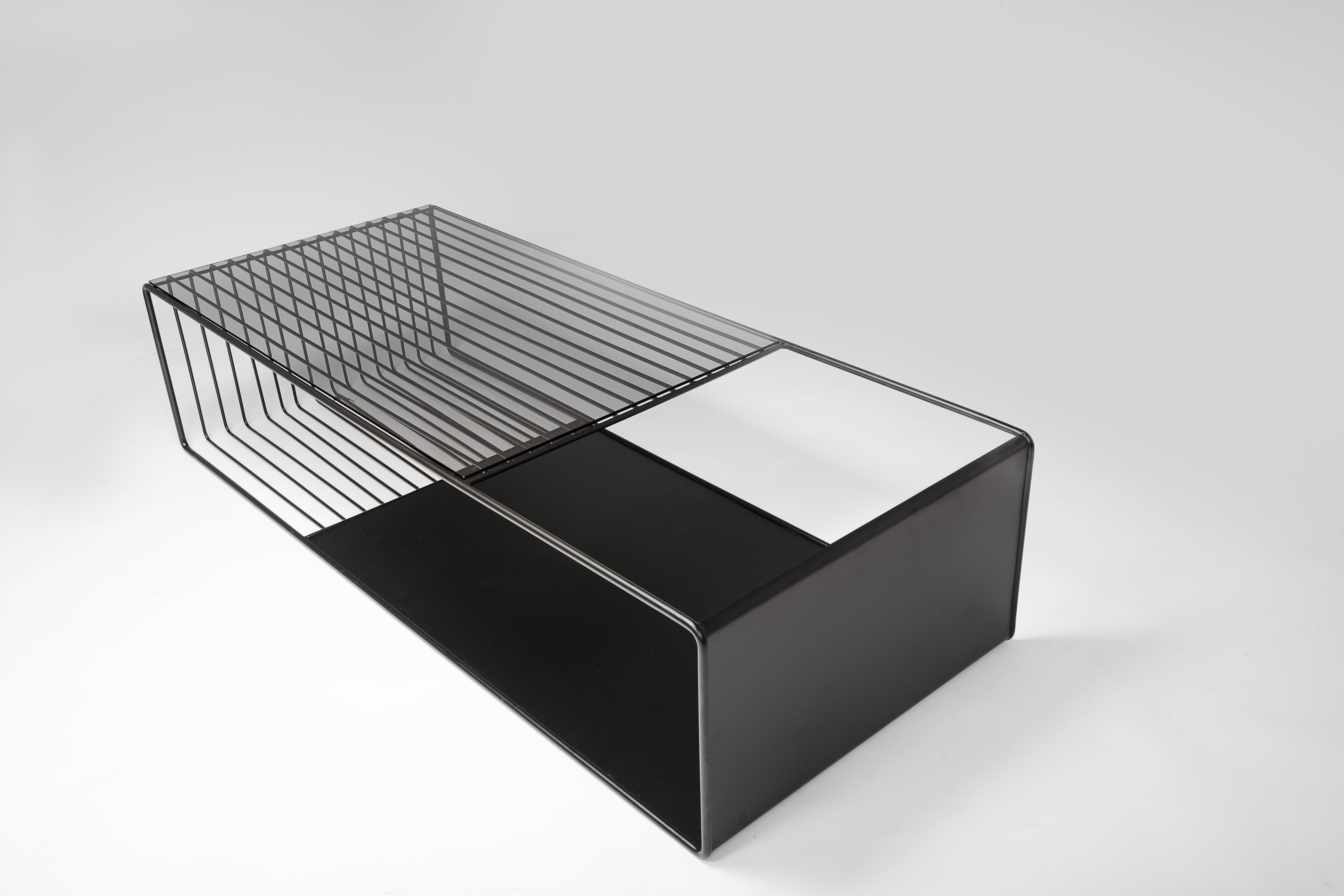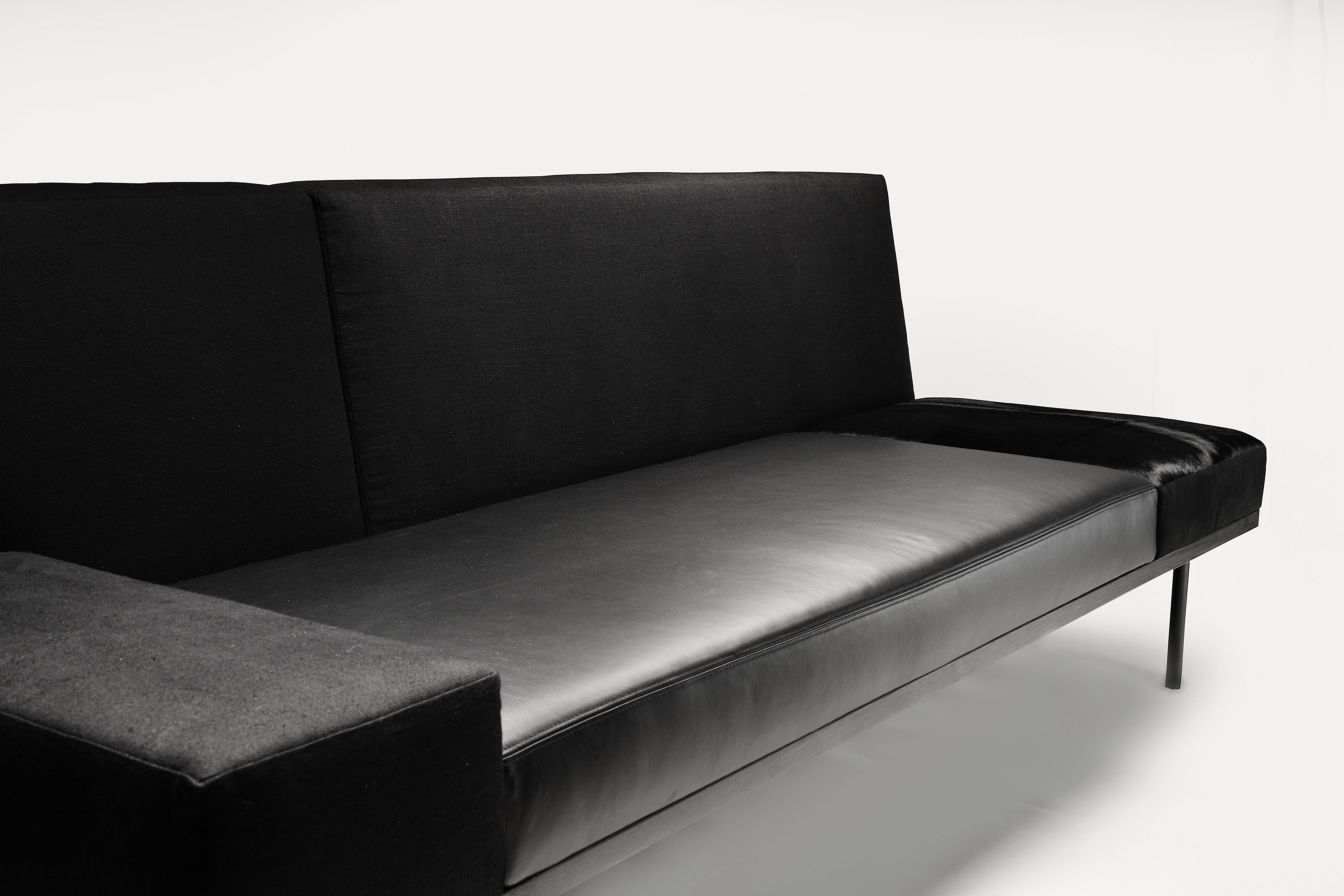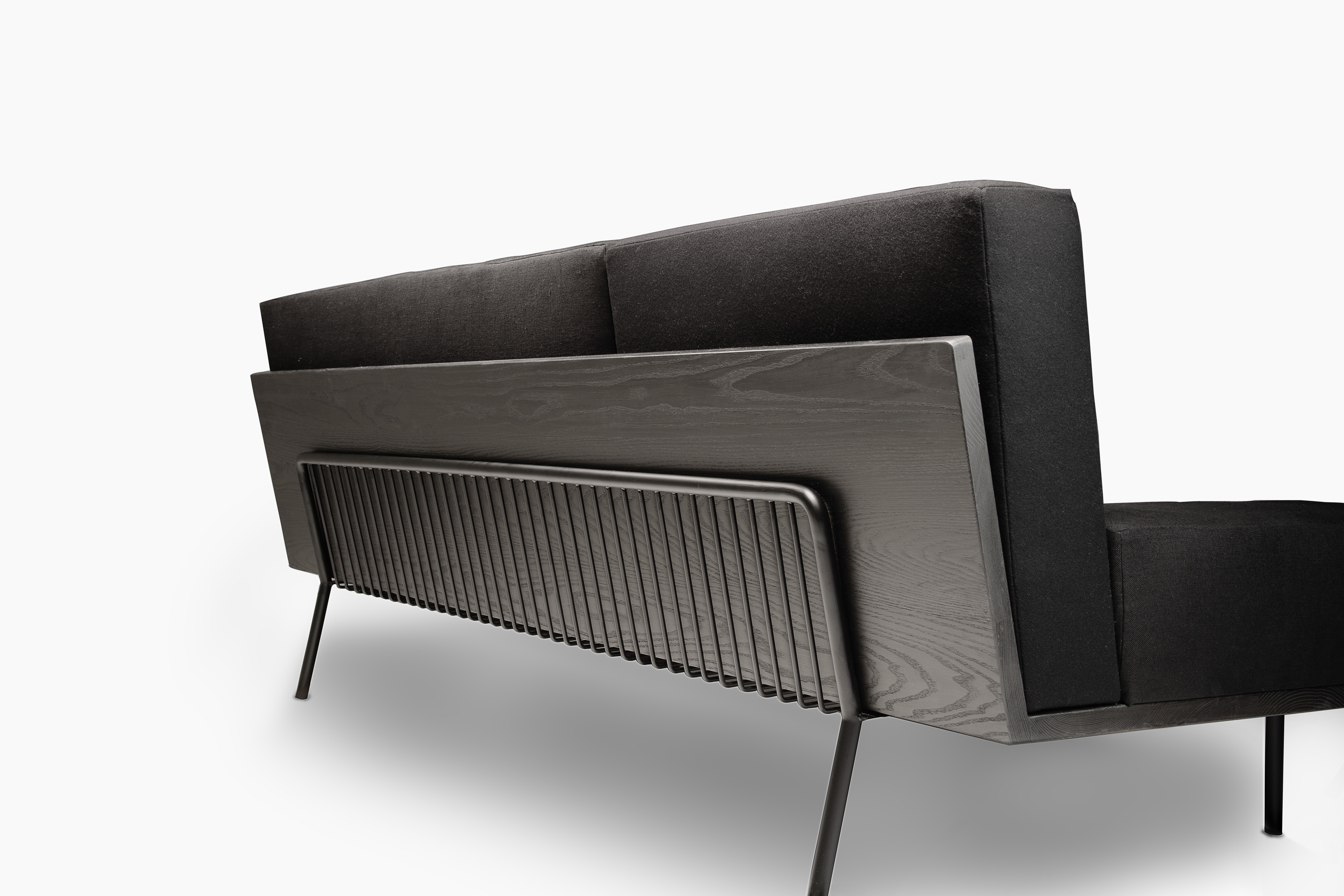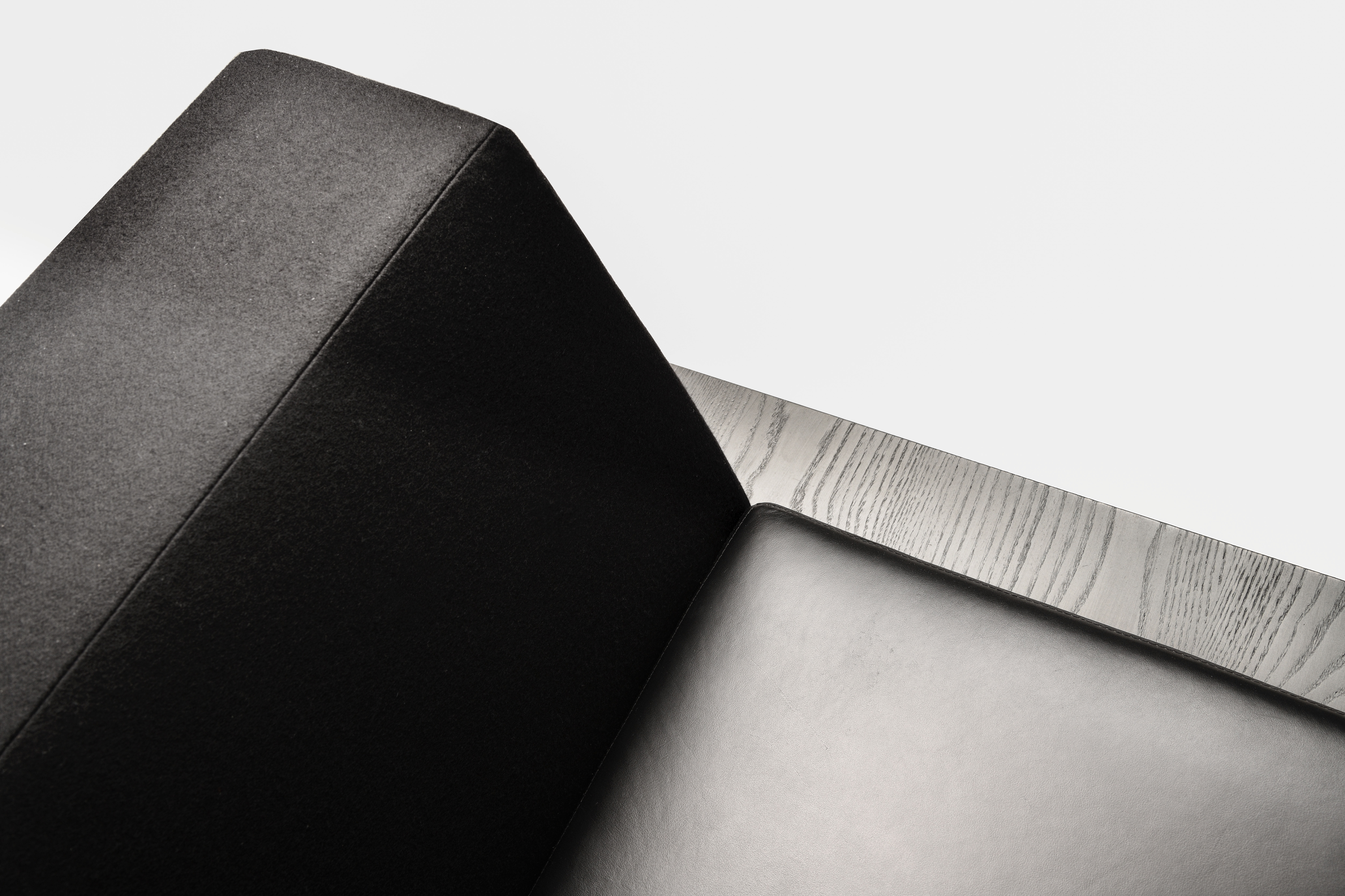 A collection of monochromatic furniture that is based on the nuance of infinite combinations of black as color, material and form. Consisting of a long sofa, a lounge chair, a coffee table, a side table, a round table and two dining seating, the collection will expose all who lounge upon it, revealing their honesty and purity. The limited use of color enhances the juxtaposition of textures and materials used in each piece. To capture the kaleidoscope of black, materials are carefully curated to create relationships that complement, contrast and juxtapose the many surfaces of black.