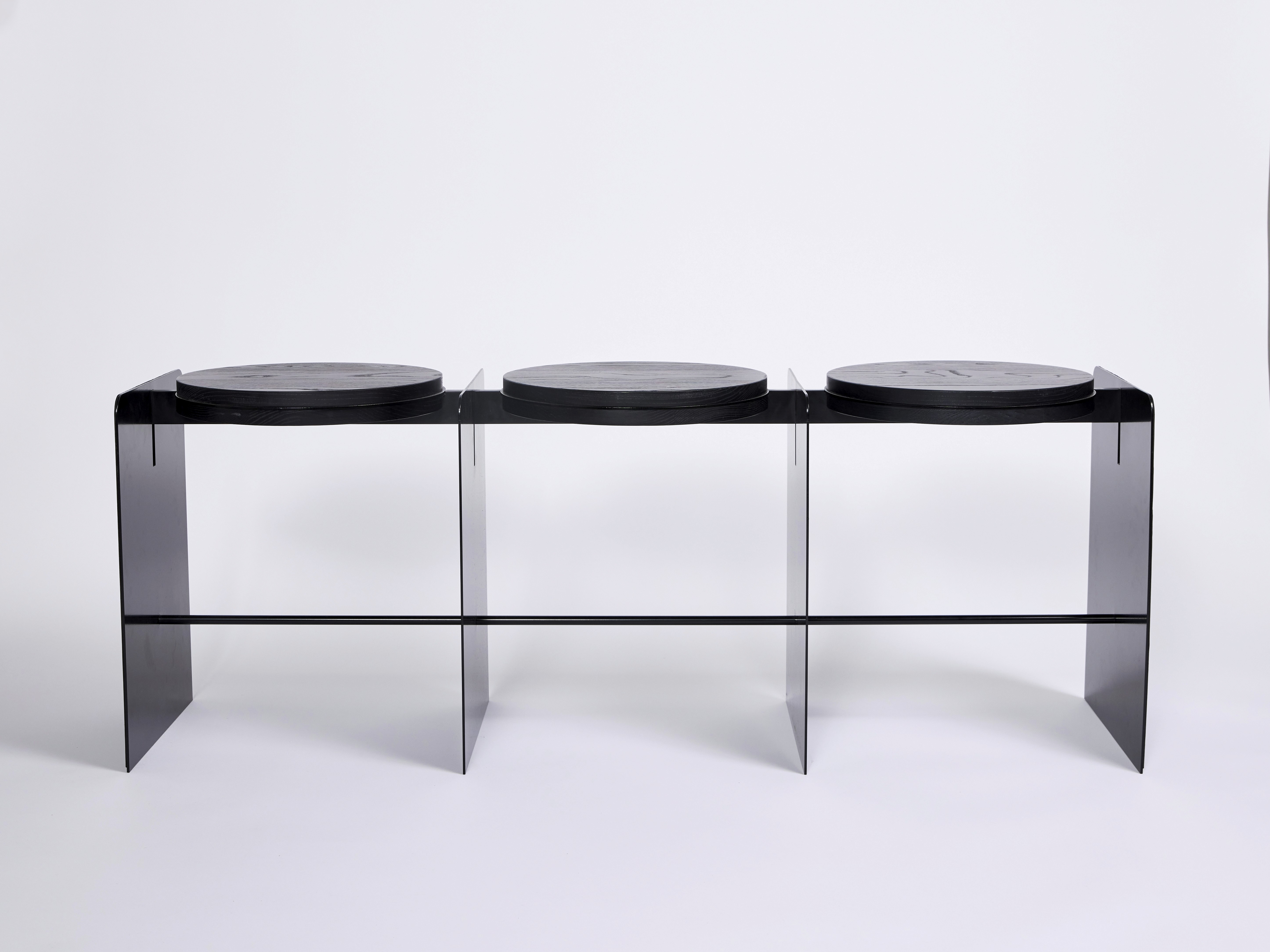 A three-seat monochromatic bench designed with clean lines and a simplistic form. Its multiplicity brings subtle intrigue and repetition while its thin metal frame plays into the abundance of negative space.