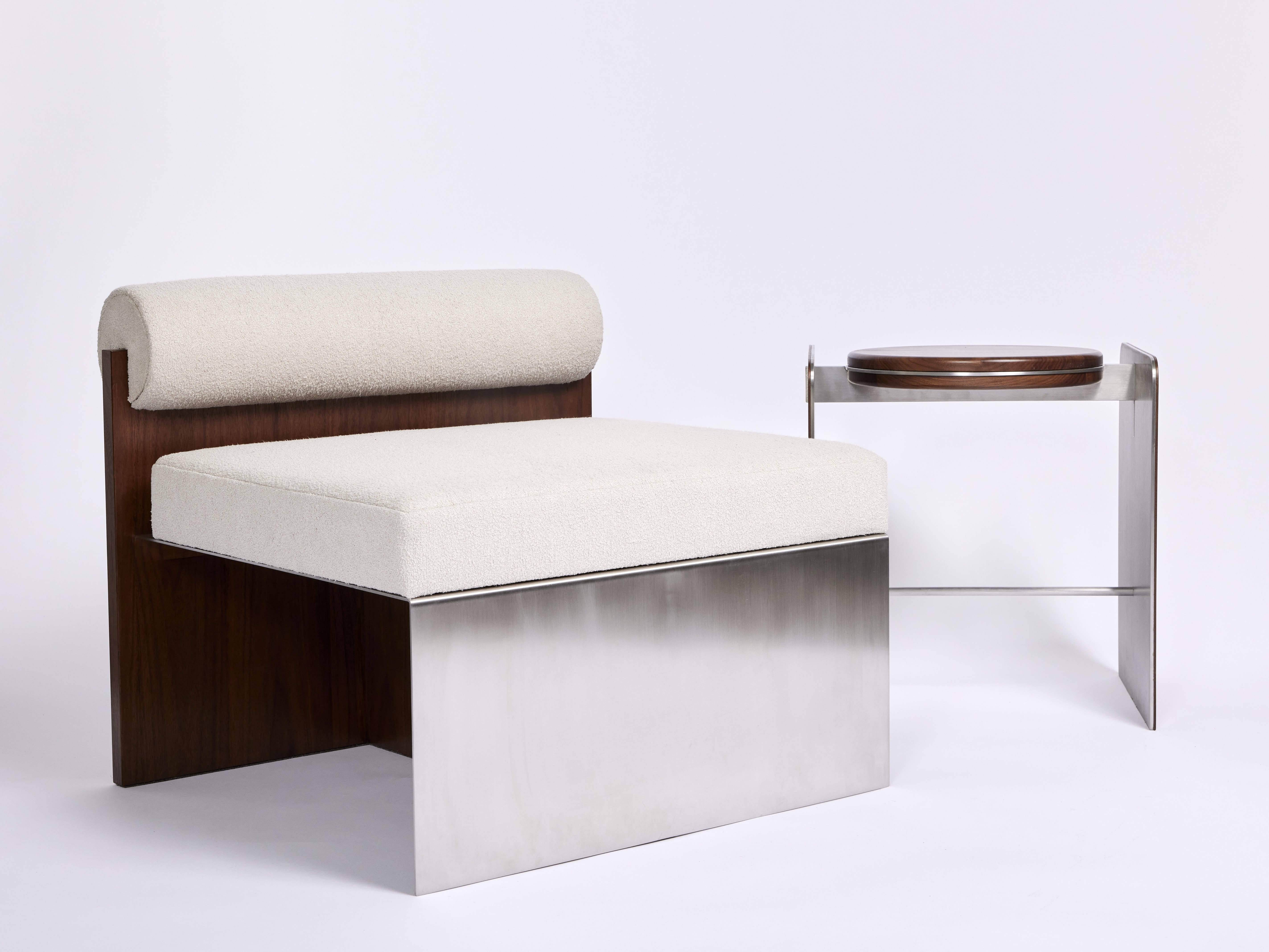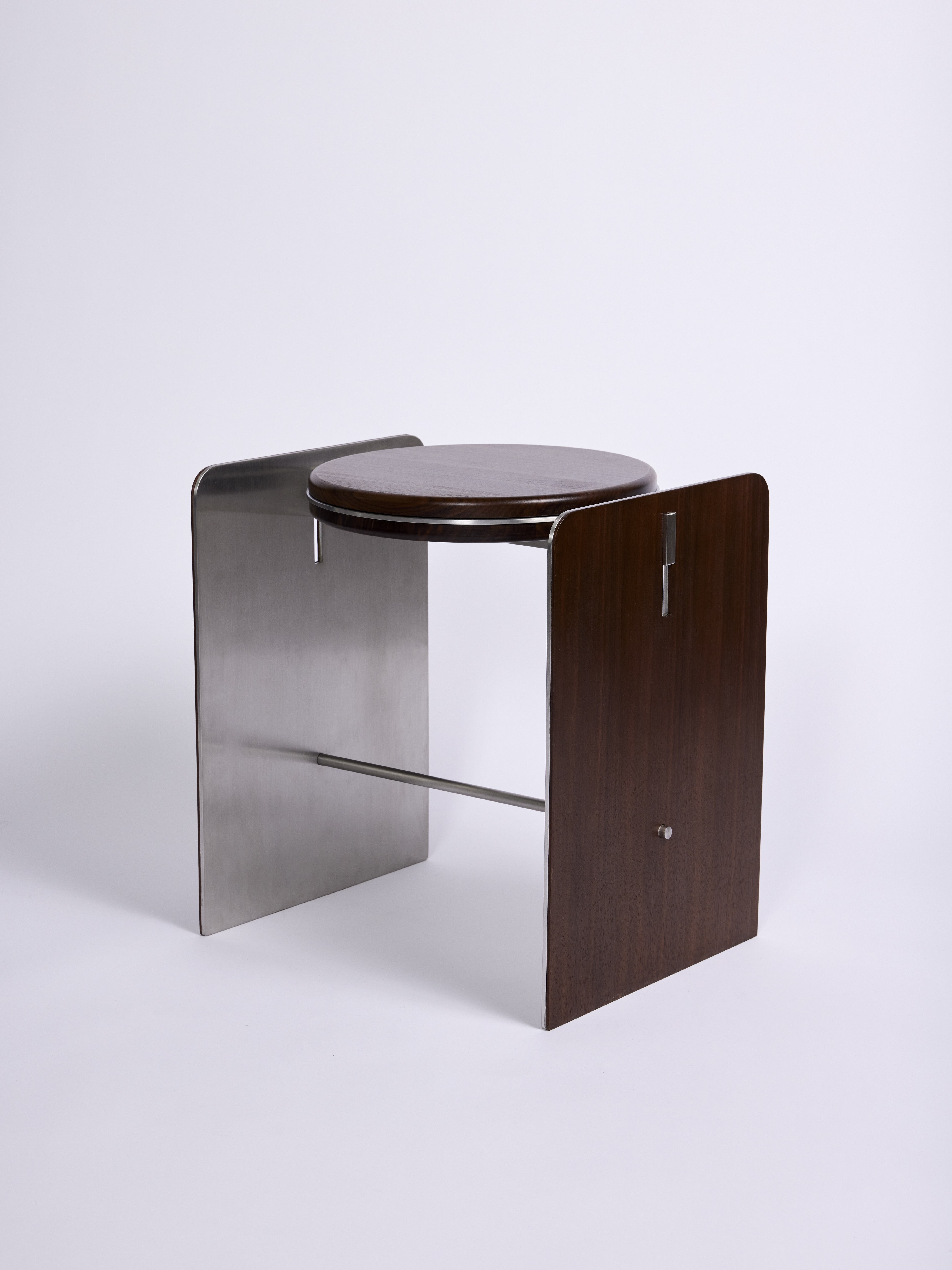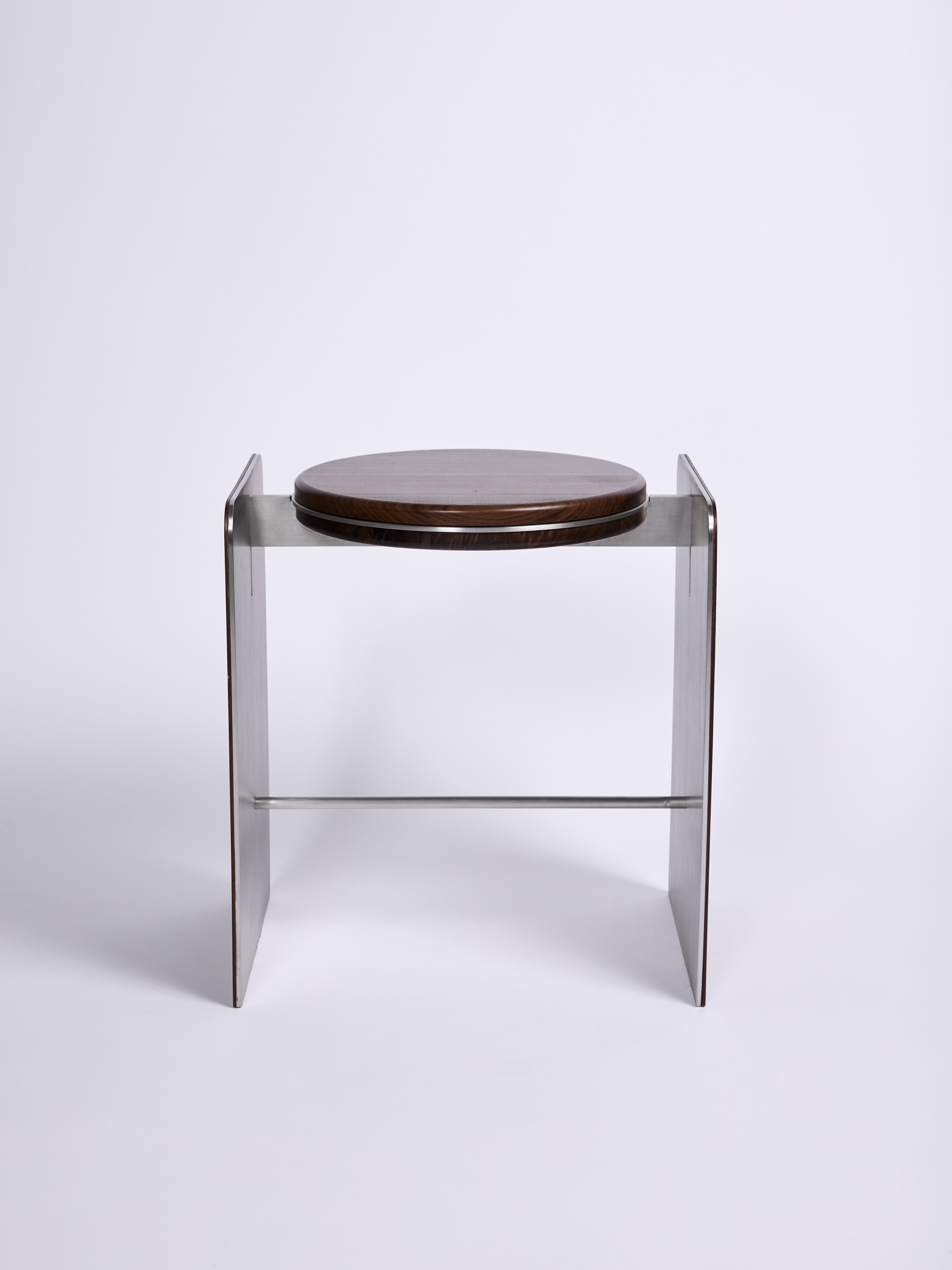 A side stool based on honest materials and pure form. Its minimal profile brings design diversity from every perspective and each component is curated to form a whole when paired with other Building Blocks pieces, the wood version is made from solid walnut seat/top, veneer sides with metal structures.