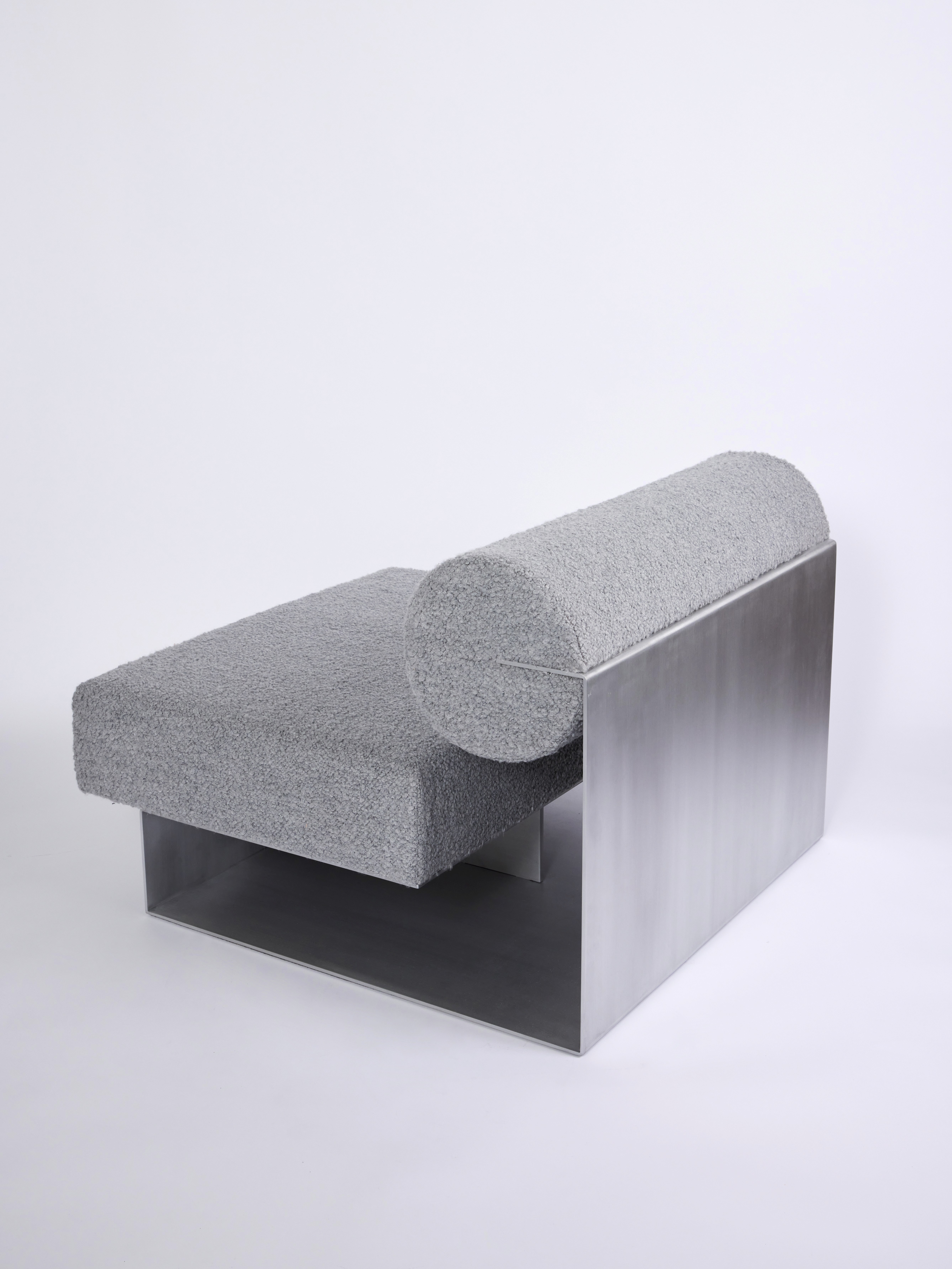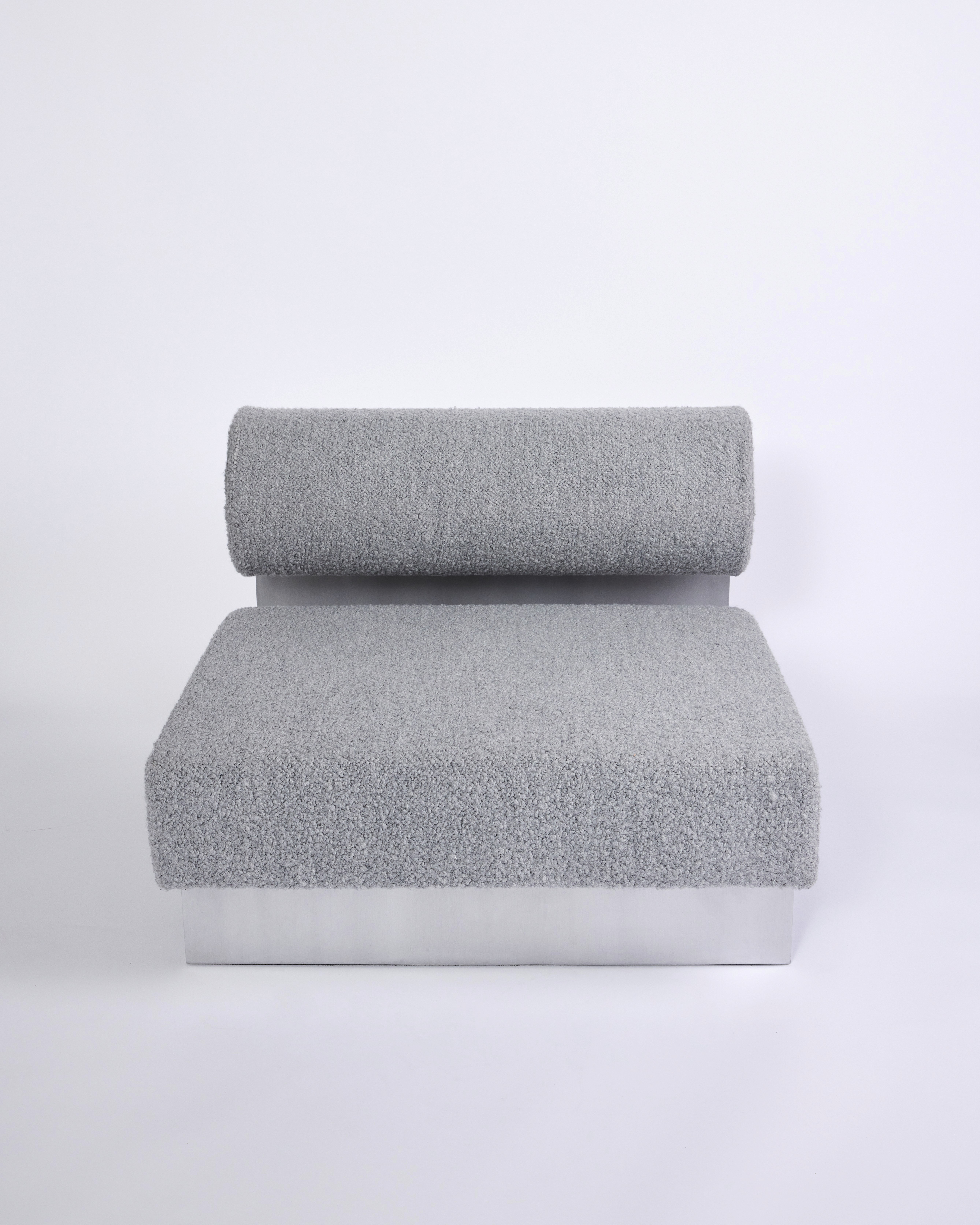 Materials: aluminum, boucle upholstery Dimensions: W35 x D38 x H27.5 inches