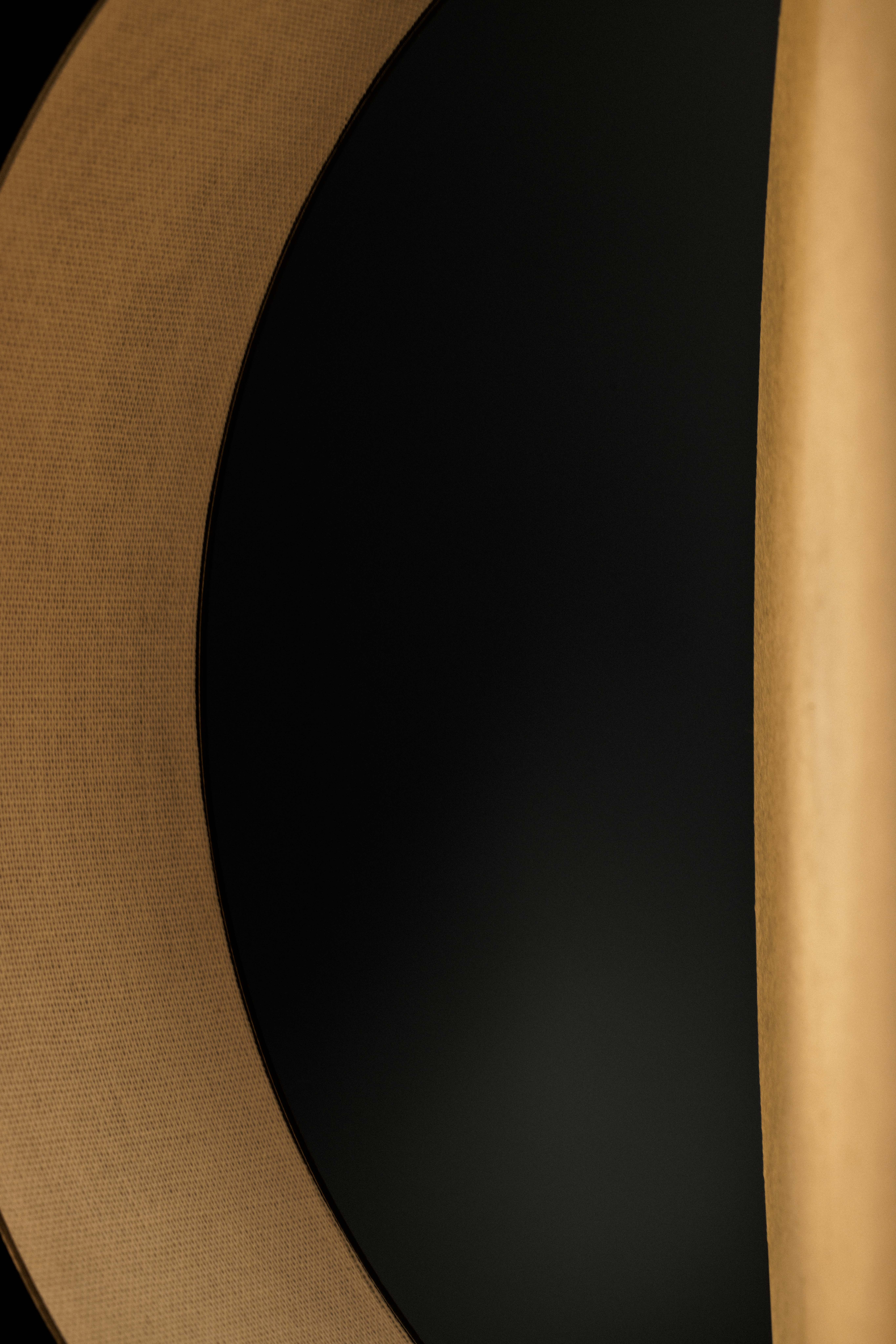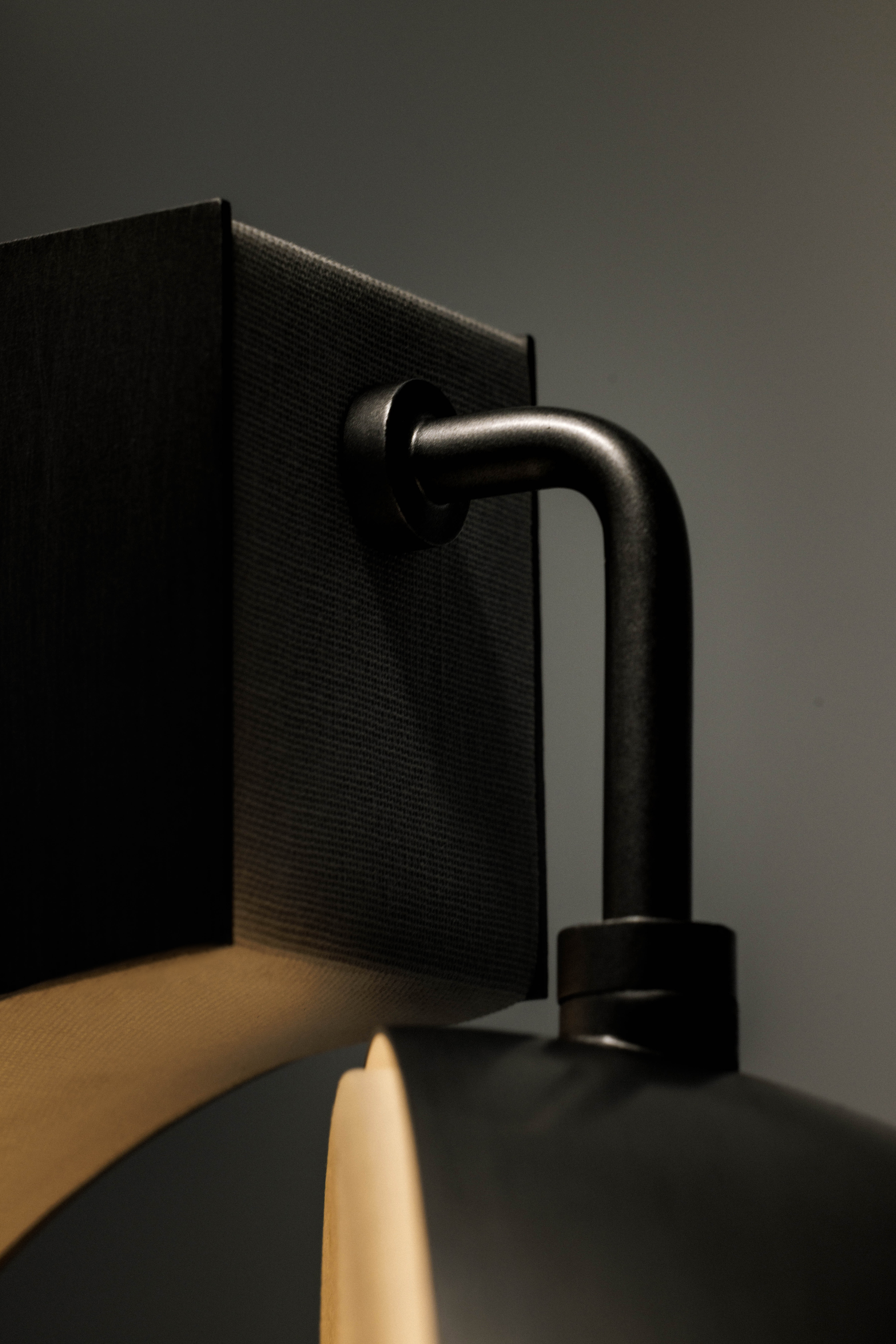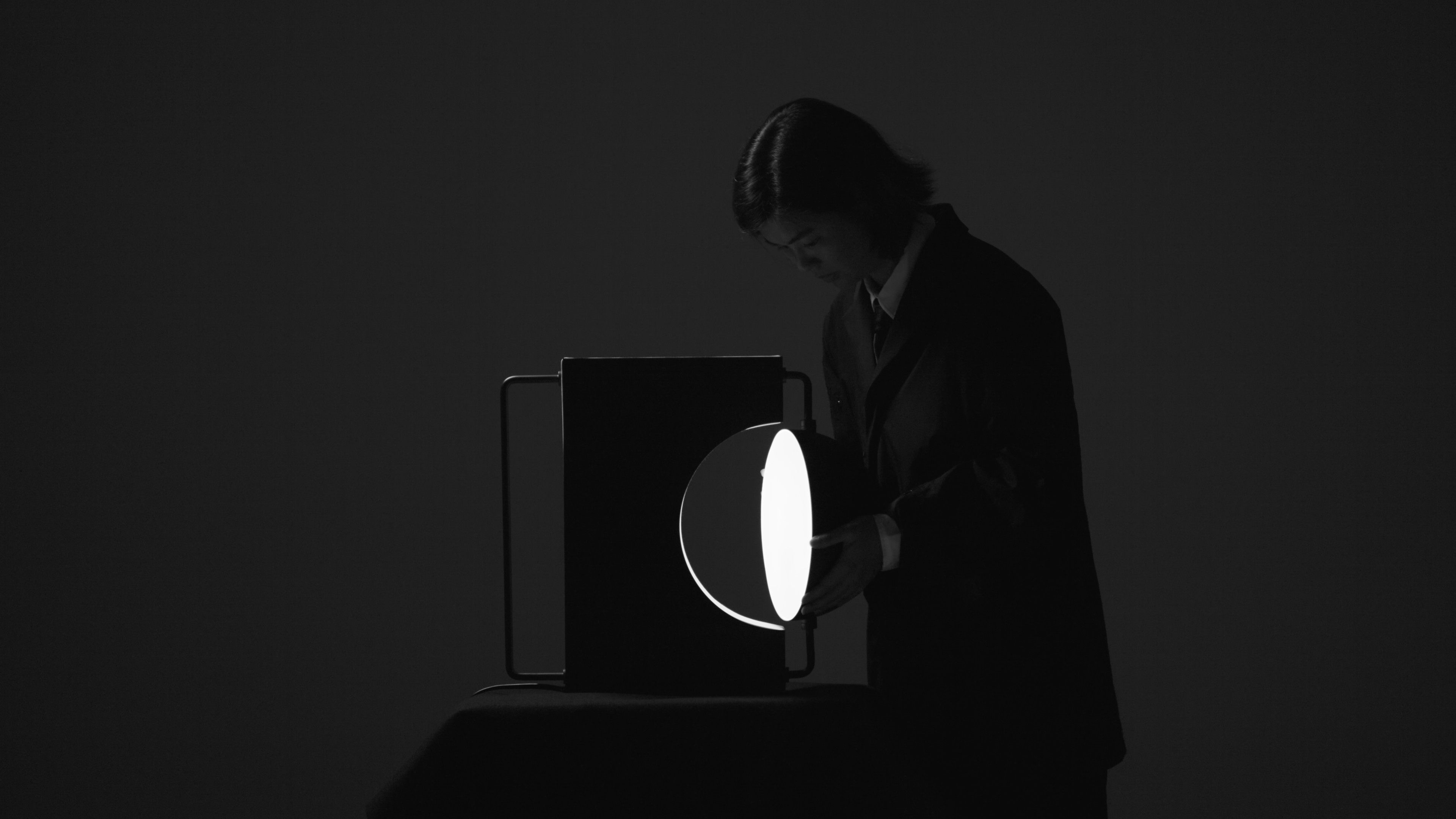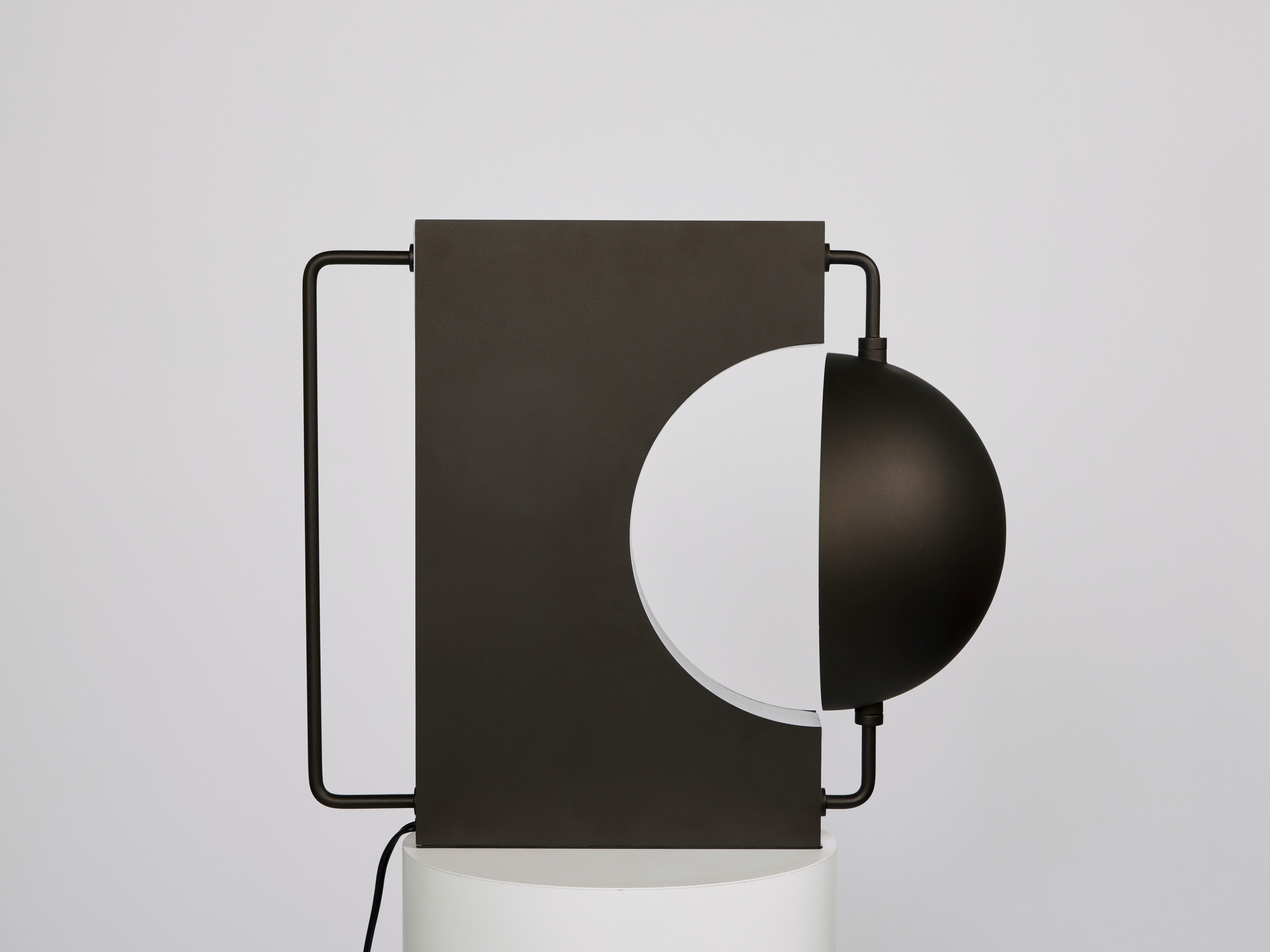 A table lamp that plays with contrasting elements of roundness and sharpness, darkness and light. Designed with a half-hollowed sphere bisecting a rectangular base and a thin square frame, the monochrome fixtures are illuminated by a light that turns 40 degrees on each side.