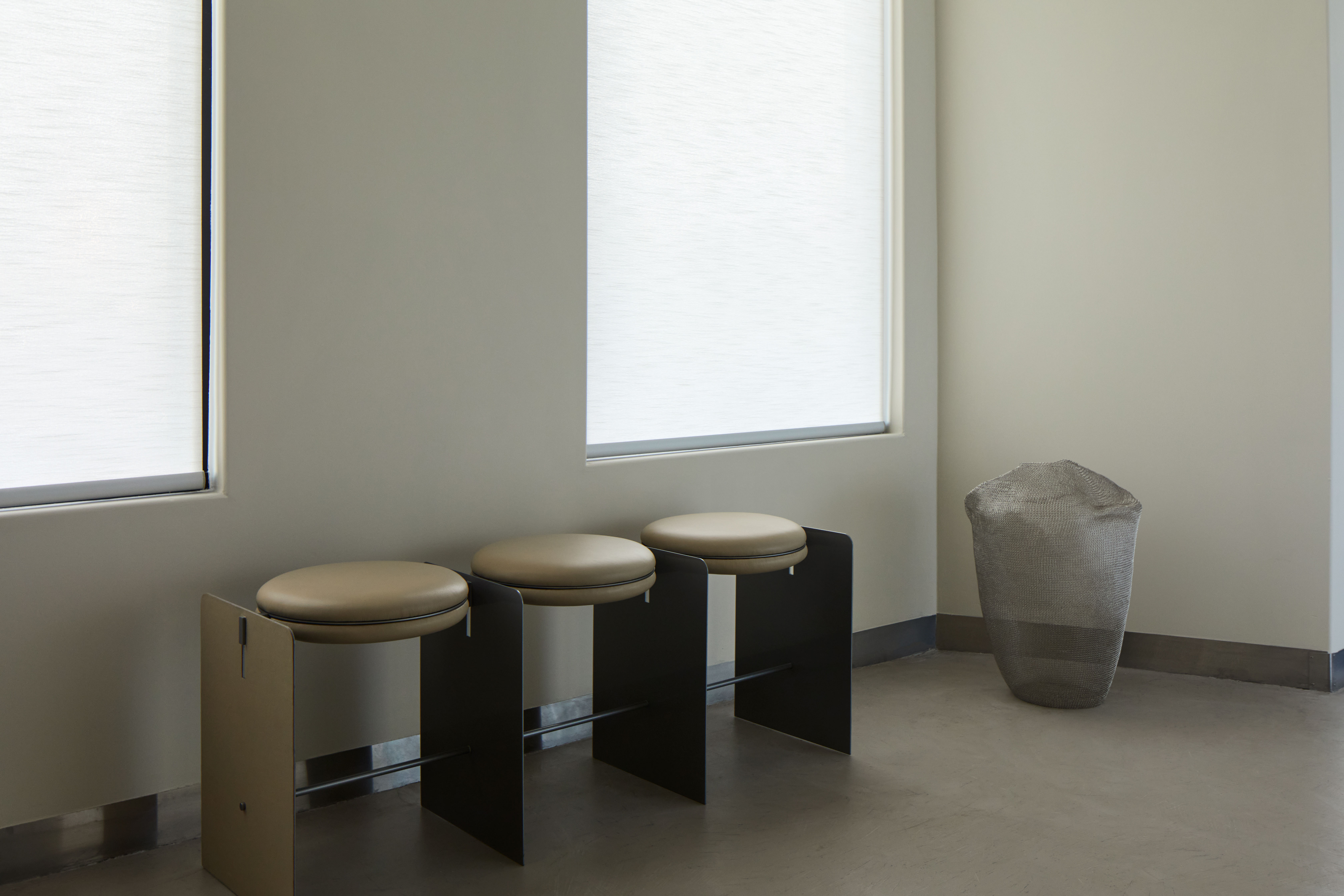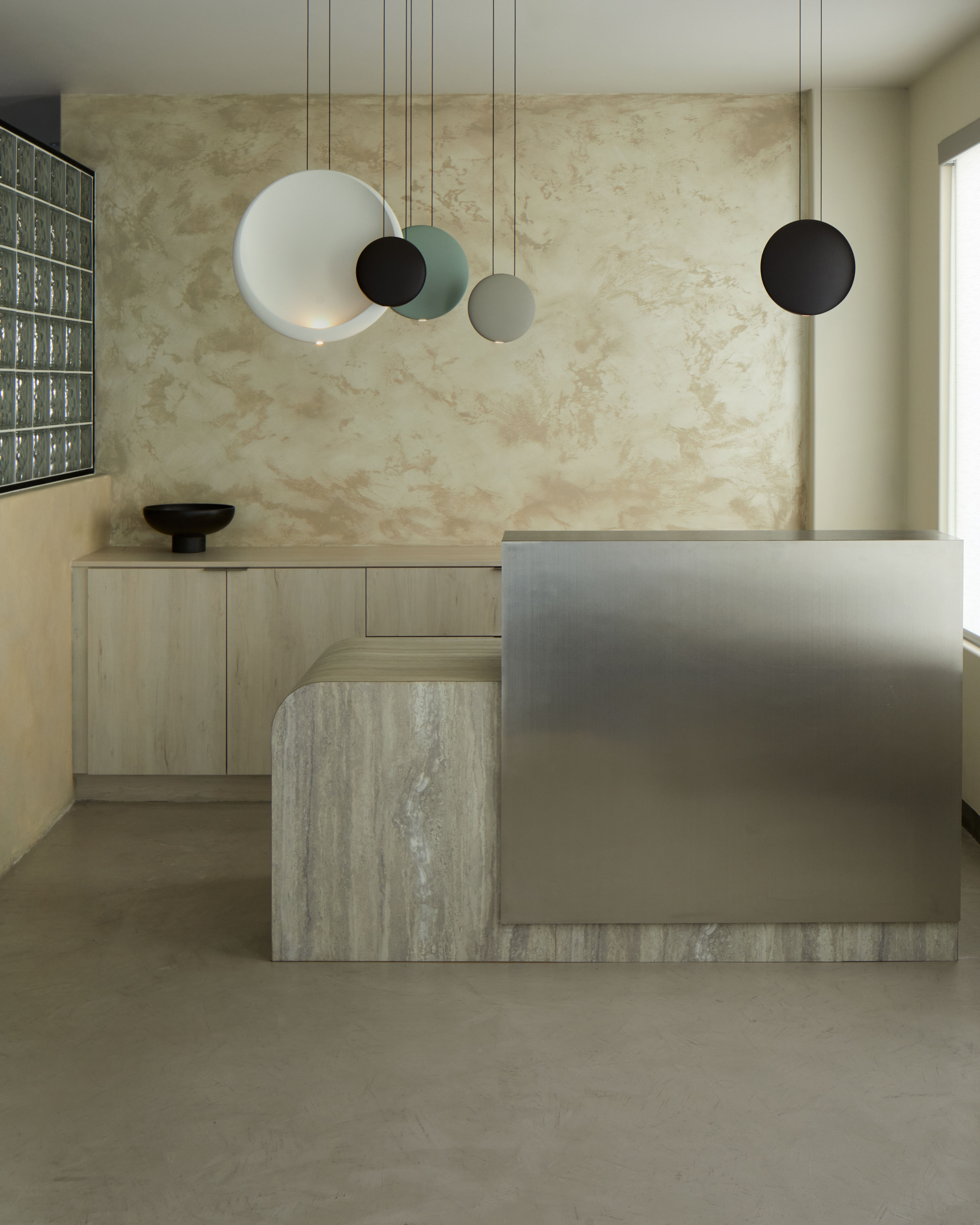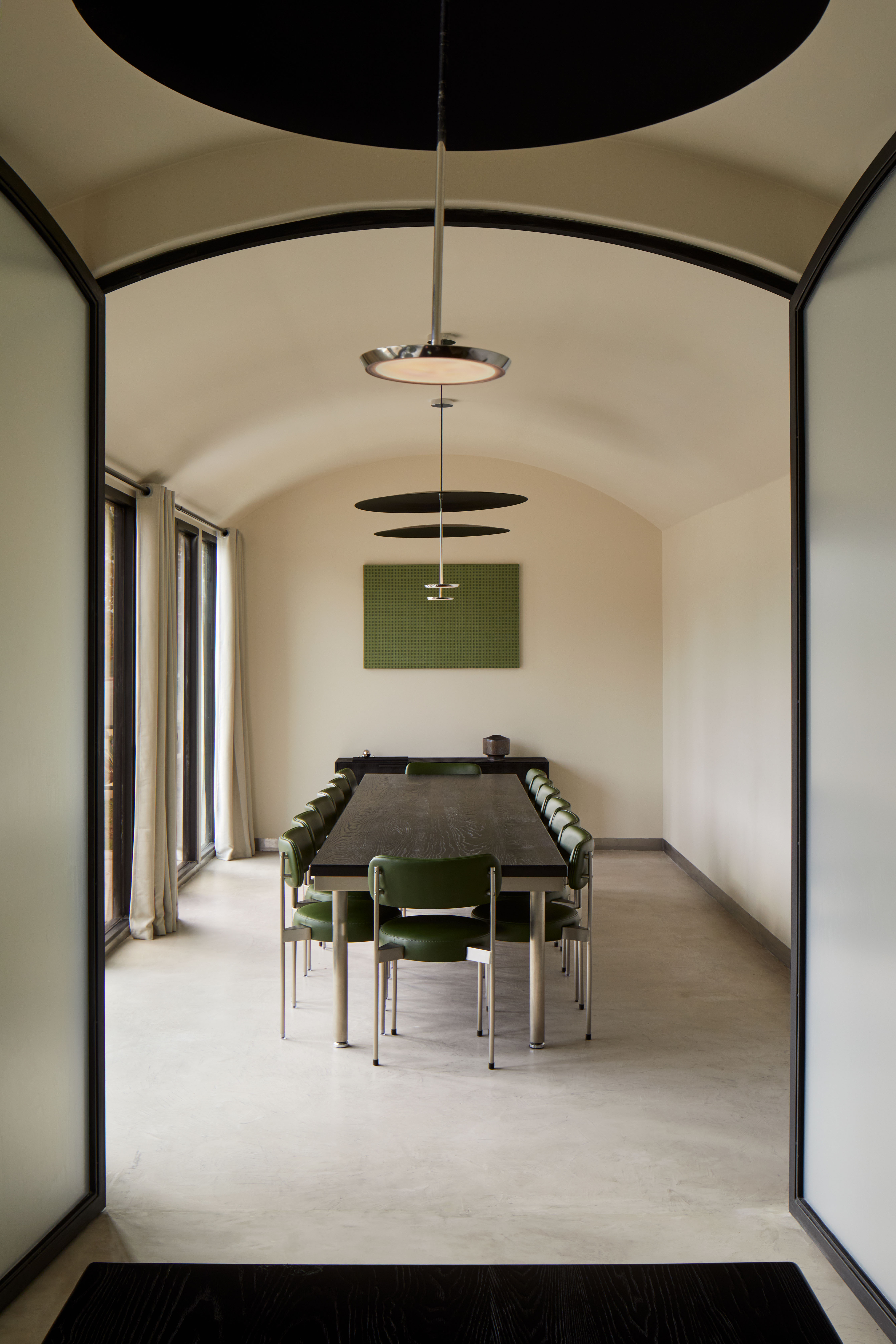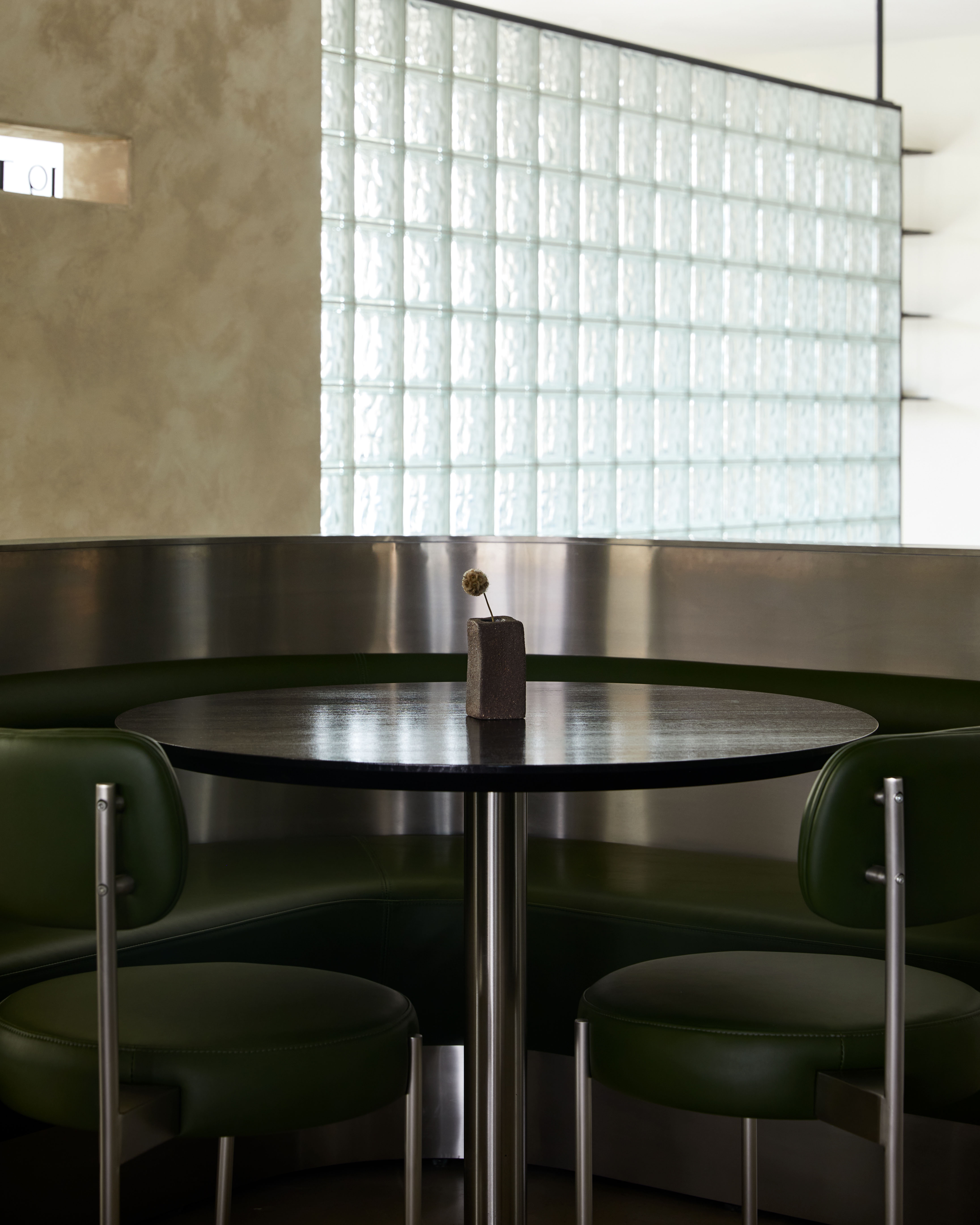 The restaurant interior forms part of an ongoing investigation in Xiong’s design practice where she studies the notion of lavish restraint, with rigorously minimal and linear forms balanced against a richness of materiality and detail. An artful choreography of dining and lounge spaces including three private dining rooms and a bar, the high-drama design integrates custom furniture, lighting, and casework for an elevated dining experience where connection around food takes center stage.